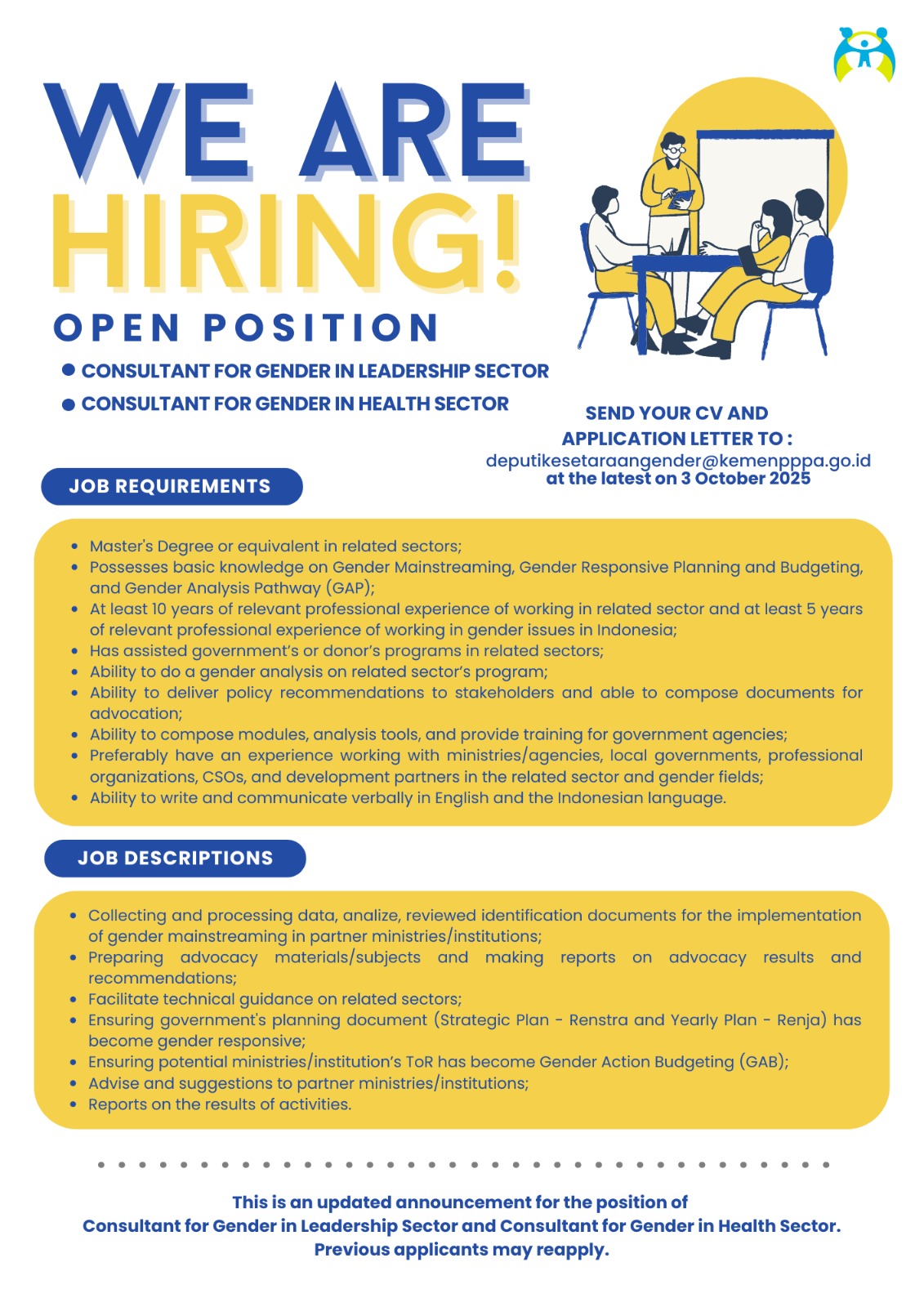 Pengumuman Perpanjangan Rekrutmen Konsultan Gender pada sektor Kepemimpinan dan Kesehatan