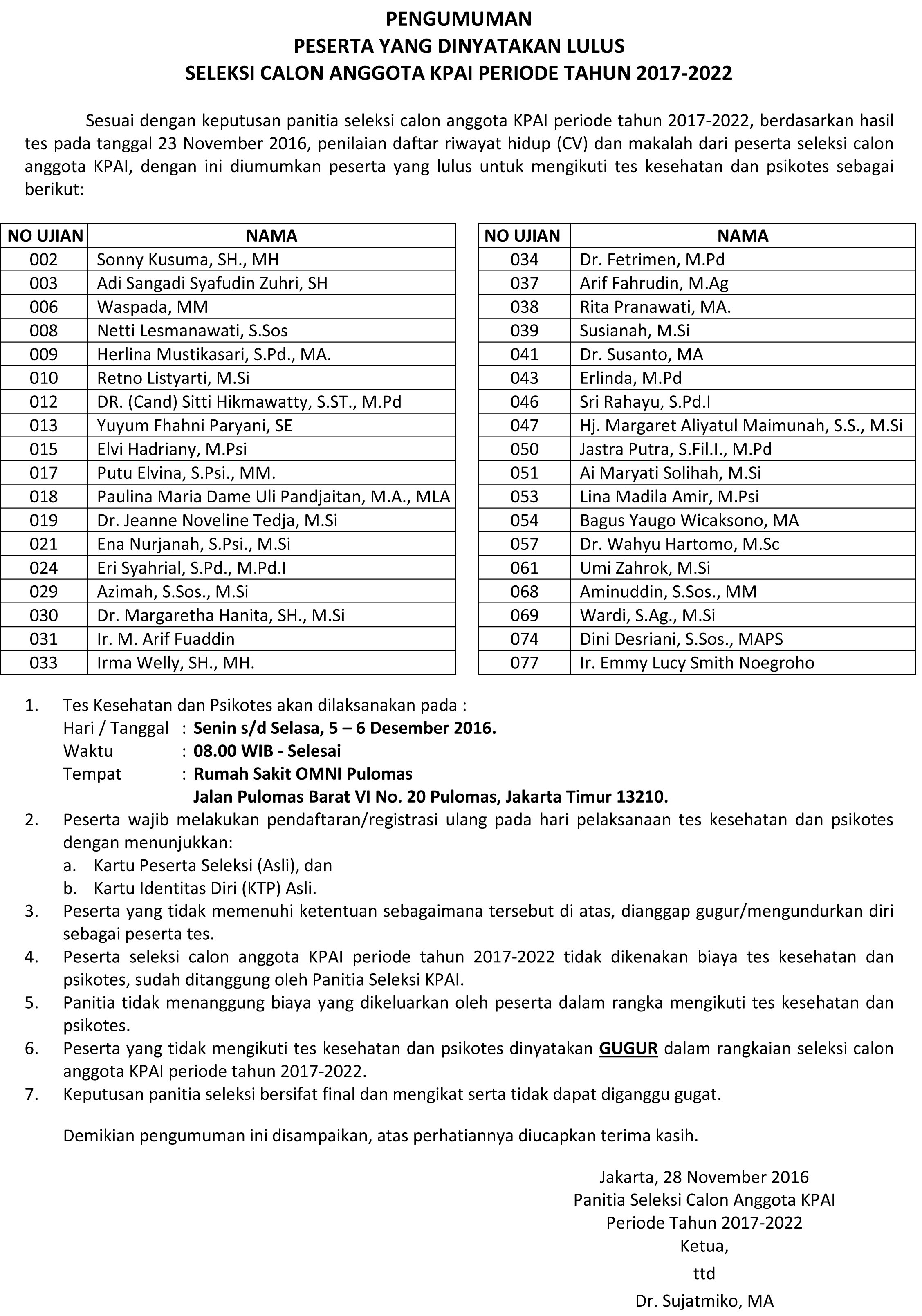 Berdasarkan Hasil Seleksi Administrasi yang Dilakukan Panitia Seleksi Calon Anggota Komisi Perlindungan Anak INdonesia (KPAI) Berikut ini Nama-nama Pelamar yang Dinyataka...