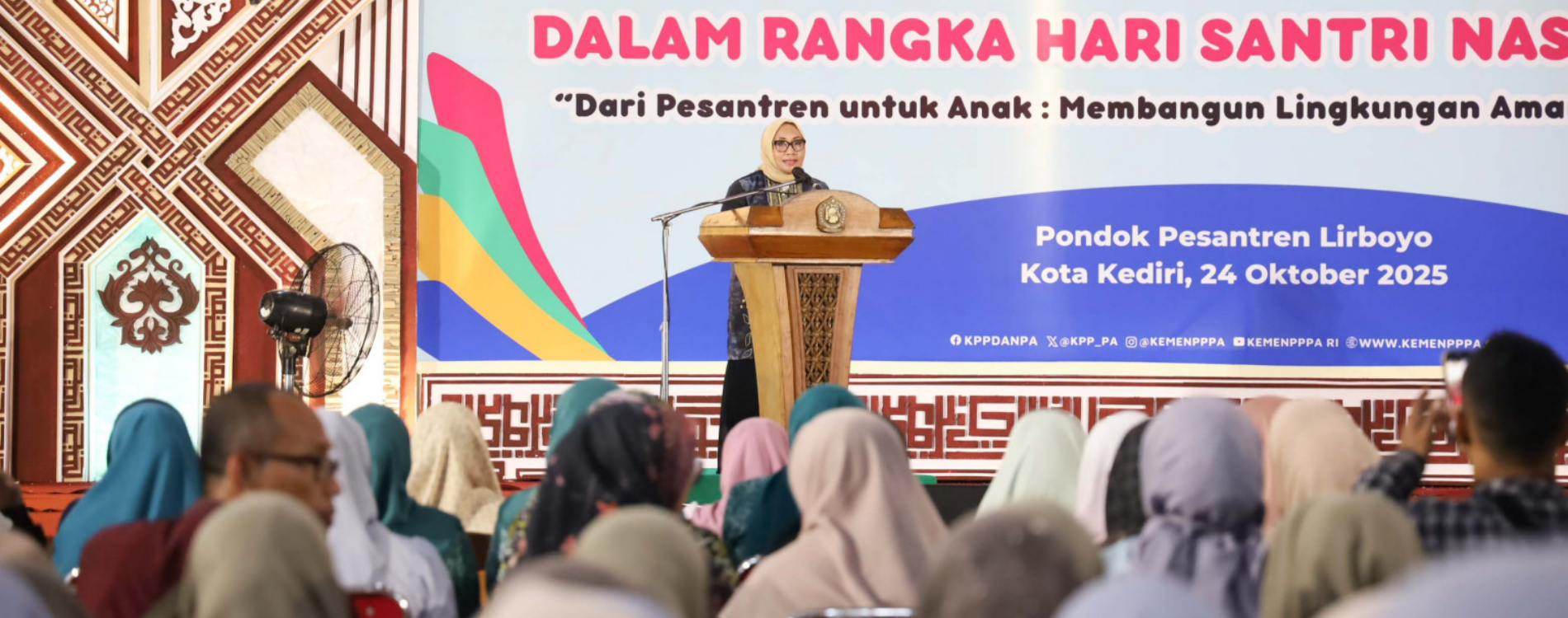 Kediri (25/10) – Menteri Pemberdayaan Perempuan dan Perlindungan Anak (Menteri PPPA), Arifah Fauzi mendorong setiap pesantren dapat memberikan lingkungan pendidikan yang aman, nyaman, dan bebas dari kekerasan. Hal itu disampaikan Menteri PPPA dalam Seminar Pesantren Ramah Anak yang digelar di Pondok Pesantren Lirboyo, dalam rangka memperingati Hari Santri Nasional 2025.