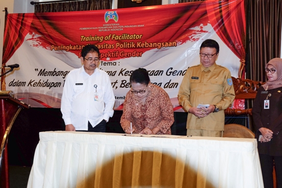 “Training Of Fasilitator (TOF) ini adalah salah satu langkah strategis sebagai pelaksanaan MOU dan bagian dari upaya membentuk fasilitator yang mampu mentransformasikan nilai-nilai politik yang berkeadilan gender. Hal ini juga merupakan upaya untuk menyukseskan NAWACITA, yang salah satu prioritasnya ialah meningkatkan keterwakilan perempuan di politik dan pengambilan keputusan,” ujar Menteri PP dan PA, Yohana Yembise pada Training Of Fasilitator (TOF) Peningkatan Kapasitas Politik Kebangsaan Perspektif Gender dan Penandatanganan Kesepakatan Bersama Menteri PP dan PA dengan Menteri Dalam Negeri di Jakarta, Selasa (27/9).