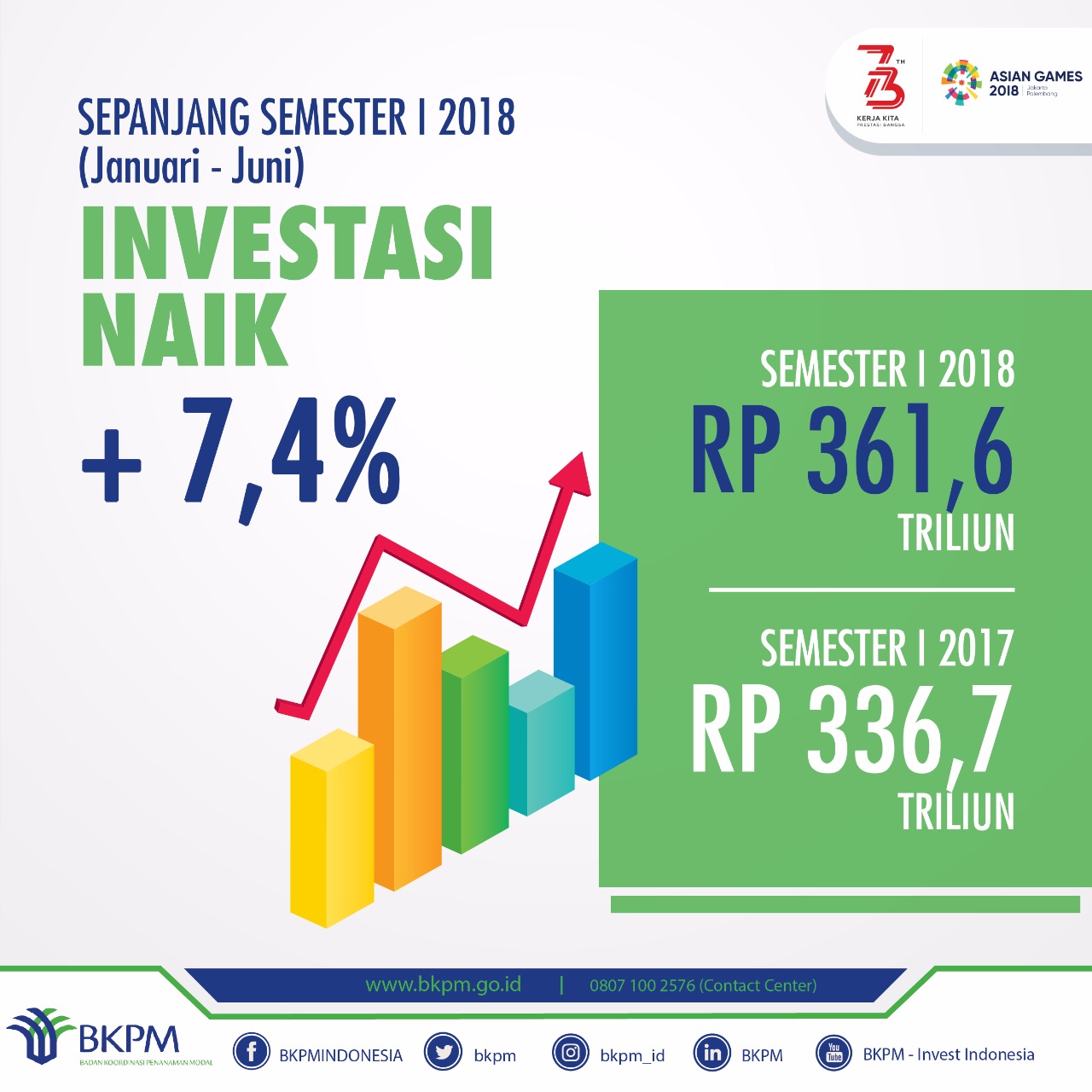 Jakarta, 14 Agustus 2018 – Badan Koordinasi Penanaman Modal (BKPM) mempublikasikan data realisasi investasi Penanaman Modal Dalam Negeri (PMDN) dan Penanaman Modal Asing (PMA) periode Triwulan II (April-Juni) Tahun 2018 yang mencapai angka sebesar Rp 176,3 triliun, mengalami peningkatan sebesar 3,1% apabila dibandingkan dengan periode yang sama tahun 2017 (sebesar Rp 170,9 triliun). Realisasi investasi tersebut menyerap 289.843 Tenaga Kerja Indonesia. Sedangkan realisasi investasi PMDN dan PMA selama Januari – Juni tahun 2018 mencapai angka Rp 361,6 triliun. Terlihat kecenderungan terjadinya perlambatan pertumbuhan realisasi investasi menjadi 3,1% (triwulan II tahun 2018 dibanding triwulan II tahun 2017), dari sebelumnya 11,8% (triwulan I tahun 2018 dibanding triwulan I tahun 2017) dan 12,7% (triwulan II tahun 2017 dibanding triwulan II tahun 2016).