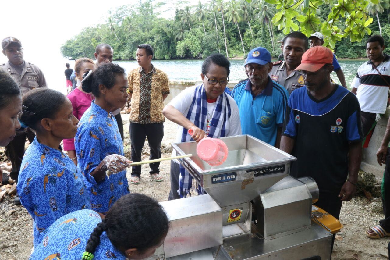 Biak Barat (8/5) – Menteri Pemberdayaan Perempuan dan Perlindungan Anak (PPPA), Yohana Yembise meninjau langsung proses pembuatan minyak Virgin Coconut Oil (VCO) hasil in...