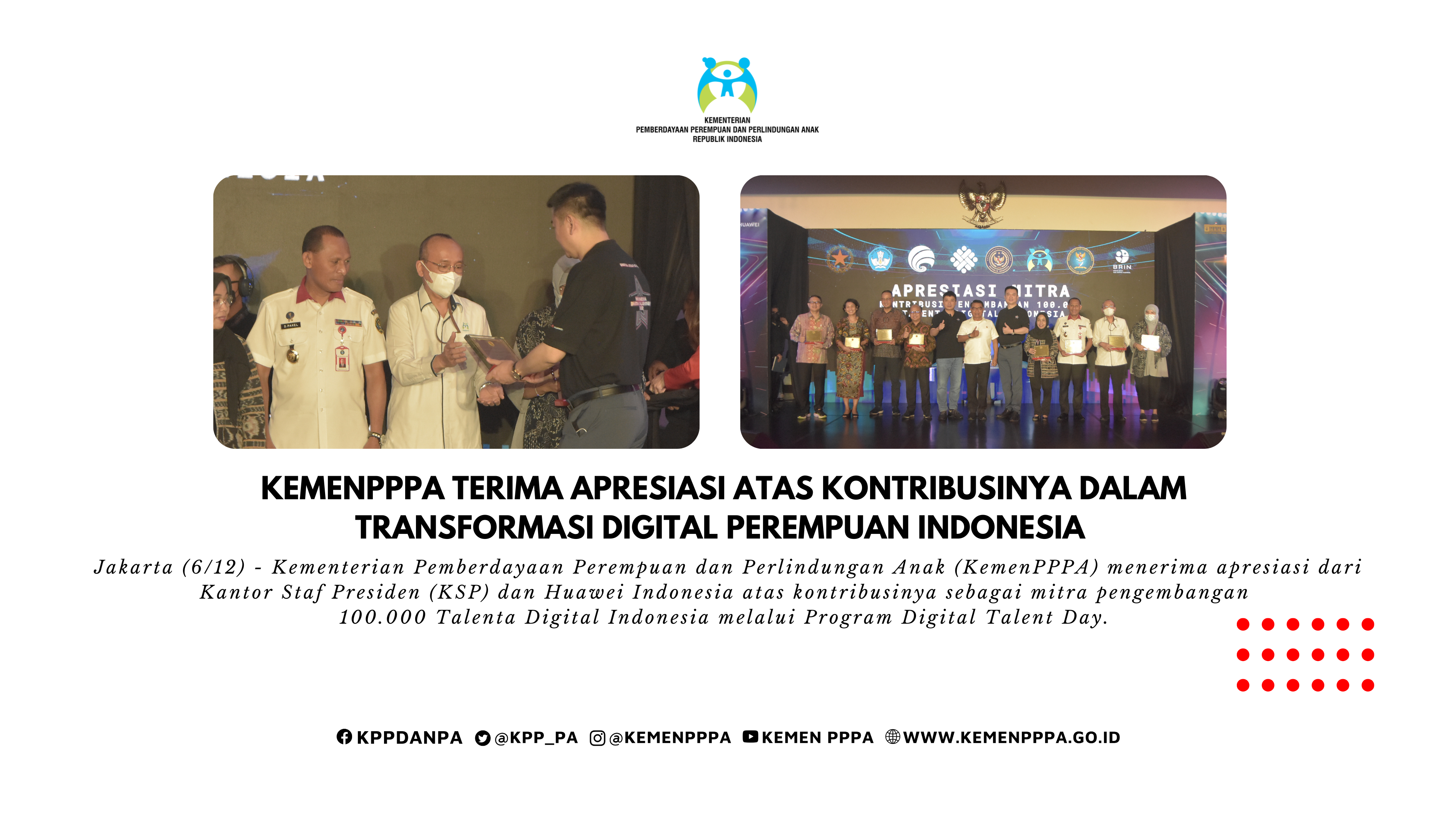 Jakarta (6/12) - Kementerian Pemberdayaan Perempuan dan Perlindungan Anak (KemenPPPA) menerima apresiasi dari Kantor Staf Presiden (KSP) dan Huawei Indonesia atas kontrib...