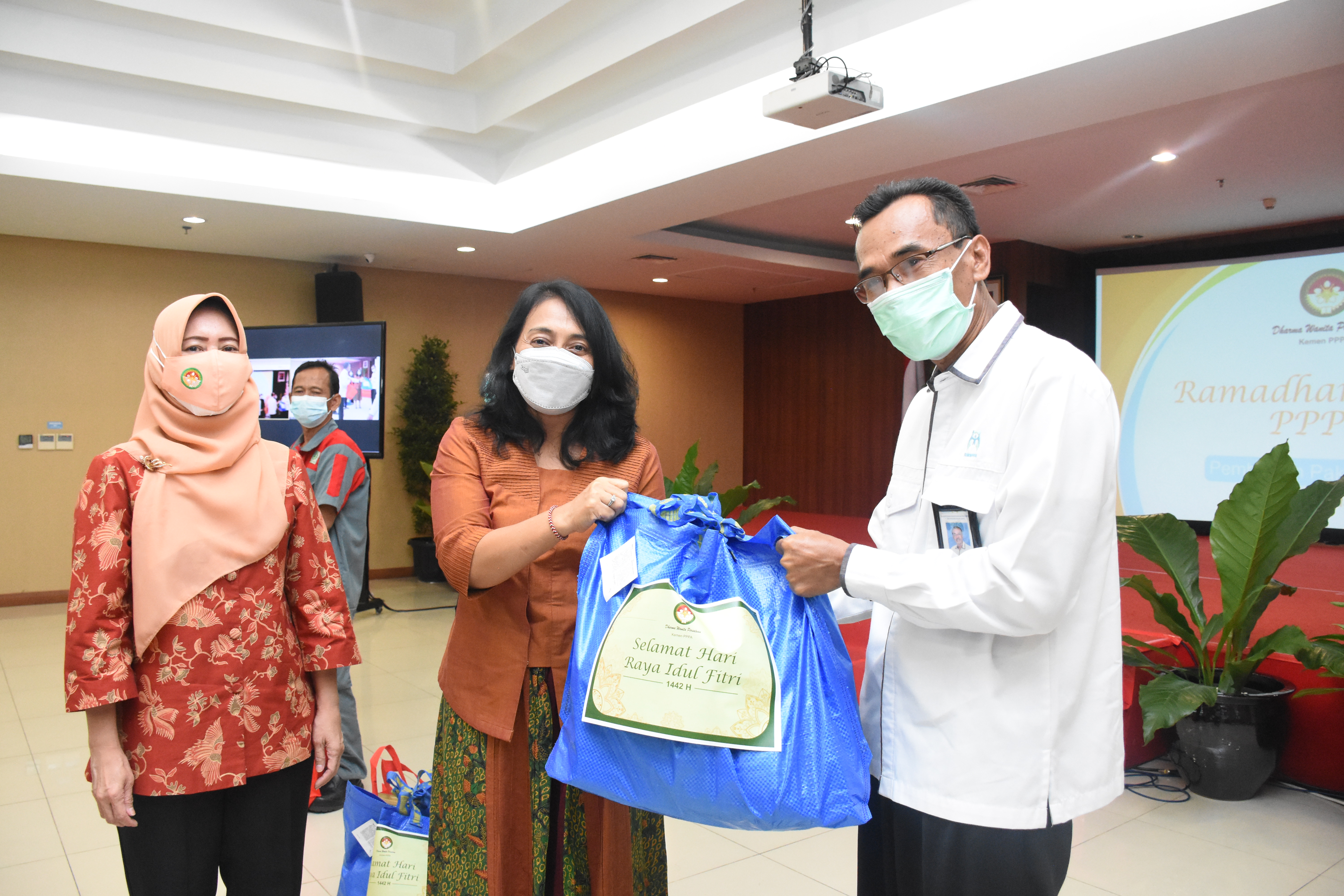 Menteri Pemberdayaan Perempuan dan Perlindungan Anak, Bintang Puspayoga secara simbolis menyerahkan 175 paket lebaran kepada staf pendukung, yaitu petugas keamanan, tekni...