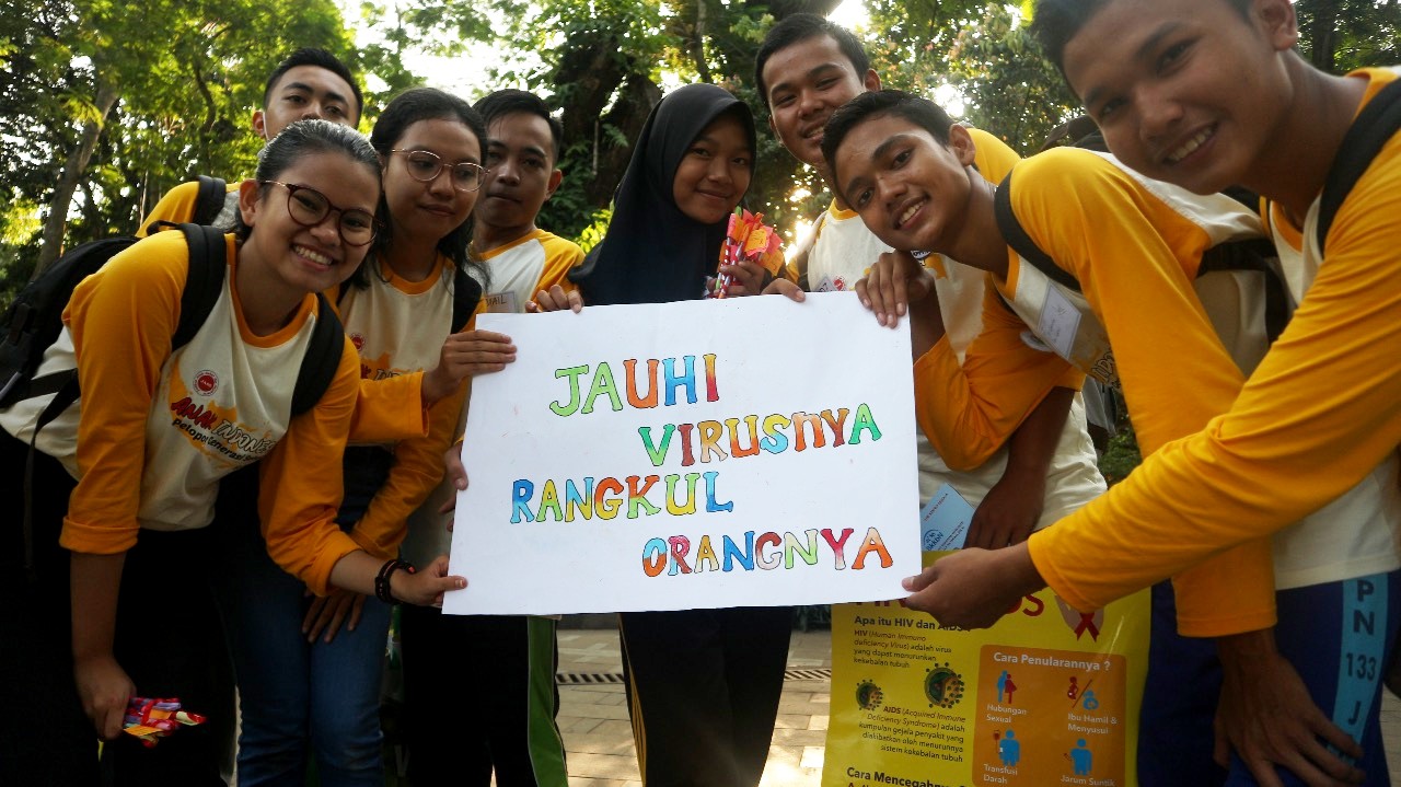 Menuju Taman Sempur, Bogor dengan membawa poster besar bertuliskan "Jauhi Virusnya, Rangkul Orangnya" para anggota Forum Anak (FA) melakukan kampanye untuk memperingati H...