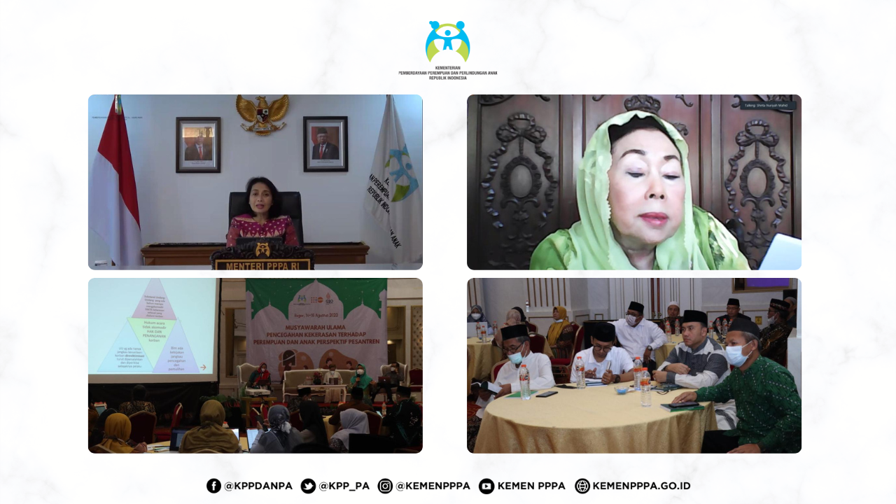 Jakarta (16/8) – Kementerian Pemberdayaan Perempuan dan Perlindungan Anak (KemenPPPA) bekerjasama dengan UNFPA menggelar ruang musyawarah dengan para Ulama di Indonesia terkait dengan pencegahan kekerasan terhadap perempuan dan anak. Dalam pertemuan tersebut, Menteri PPPA, Bintang Puspayoga, menyatakan pentingnya dukungan dan peran serta dari tokoh agama dalam pencegahan kekerasan terhadap perempuan dan anak, secara umum, maupun yang terjadi secara khusus di lingkungan Pesantren.