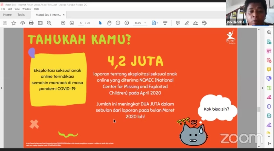 Jakarta (30/06) Eksploitasi seksual anak online terindikasi semakin merebak di masa pandemi Covid-19. Berdasarkan laporan National Center for Missing and Exploited Children (NCMEC) pada April 2020, jumlah eksploitasi seksual anak mencapai 4,2 juta. Jumlah ini meningkat 2 (dua) juta dalam sebulan dari laporan pada Maret 2020. Selama masa pandemi, intensitas gawai pada anak memang meningkat, terutama untuk mengakses media sosial ketika mereka merasa jenuh di rumah. Namun, masih banyak anak yang tidak sadar bahwa ada predator seksual anak yang mengintai mereka.