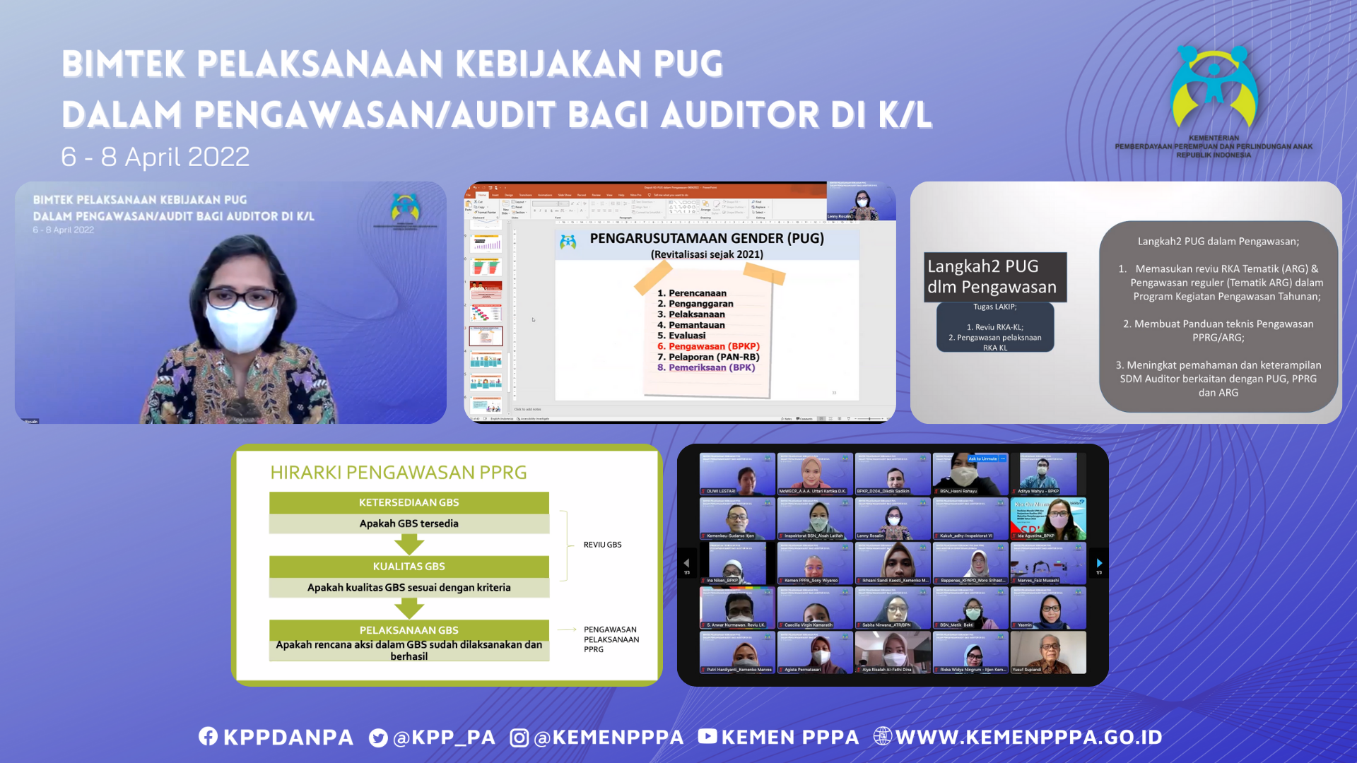 Jakarta (12/4) – Kementerian Pemberdayaan Perempuan dan Perlindungan Anak (KemenPPPA) menyelenggarakan Bimbingan Teknis Pelaksanaan Pengarusutamaan Gender (PUG) dalam Pengawasan/Audit bagi Auditor di Kementerian/Lembaga pada 6-8 April 2022 secara virtual dalam rangka peningkatan pemahaman auditor dan memastikan komitmen Kementerian/Lembaga untuk melaksanakan PUG dalam Pengawasan/Audit demi terwujudnya kesetaraan gender. Peserta Bimtek Pelaksanaan PUG dalam Pengawasan/Audit bagi Auditor berasal dari: (1) Kementerian Koordinator Bidang Maritim dan Investasi; (2) Kementerian Pariwisata dan Ekonomi Kreatif; (3) Badan Standarisasi Nasional; (4) Kementerian Badan Usaha Milik Negara; (5) Kementerian Komunikasi dan Informatika; dan (6) Kementerian ATR/BPN.