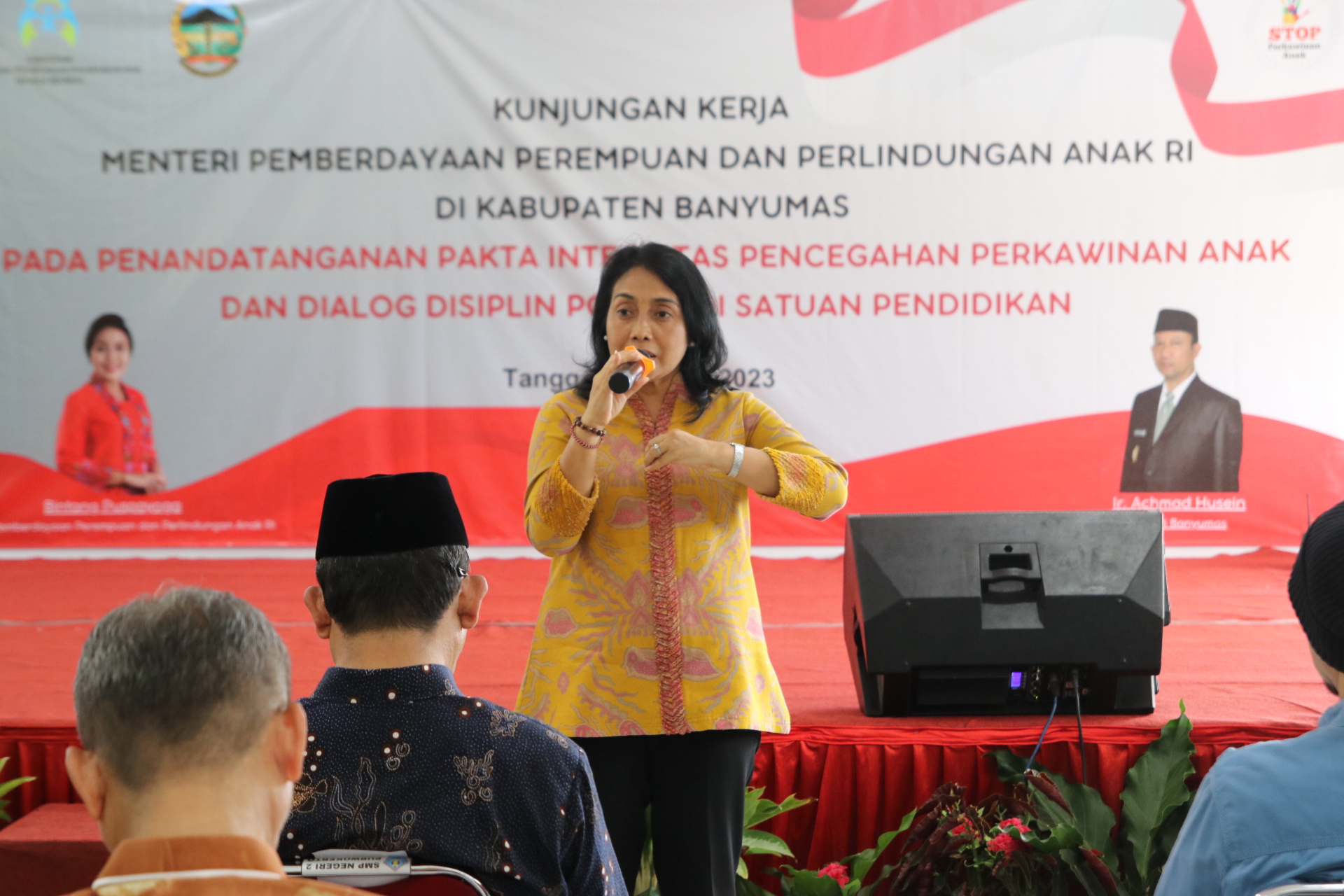 “Kami mengucapkan terima kasih dan apresiasi kepada Bapak Bupati beserta jajarannya, yang akan memperkuat kebijakan pencegahan perkawinan anak dengan komitmen strategis yang berfokus pada faktor-faktor yang berkontribusi pada peningkatan angka perkawinan anak, diantaranya keterbatasan pada akses pendidikan, dan ketiadaan akses layanan dan informasi. Perkawinan anak, pencegahannya menjadi sangat penting dilakukan karena banyak menimbulkan dampak negatif. Dari sisi kesehatan, akan meningkat angka kematian ibu, angka kematian bayi, anak melahirkan anak. Demikian juga dari sisi ekonomi, mereka belum siap menjadi tulang punggung keluarga, maka akan menjadi penting pencegahan perkawinan di usia anak. Pada kesempatan yang baik ini saya melihat komitmen Bupati Banyumas yang didampingi oleh partner kerjanya, tim penggerak PKK, komitmennya sangat luar biasa ketika bicara masalah pencegahan perkawinan anak,” ujar Menteri PPPA.