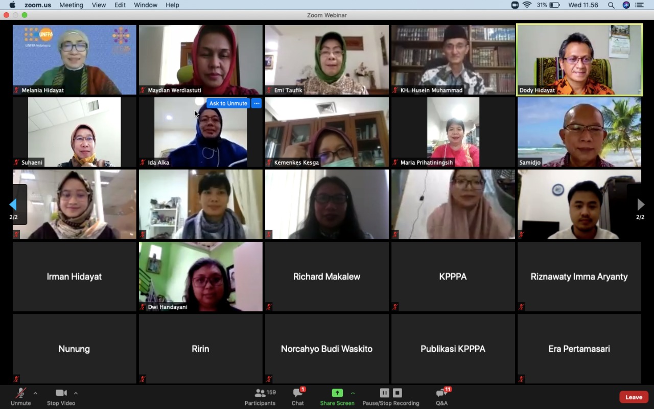 Webinar ini merupakan kerjasama Kementerian Pemberdayaan Perempuan dan Perlindungan Anak (Kemen PPPA) dengan UNFPA Indonesia. Webinar dibuka oleh Menteri PPPA Bintang Puspayoga, UNFPA Representative untuk Indonesia Anjali Sen, dan Kepala BKKBN dr. Hasto Wardoyo. Webinar juga menghadirkan Assistant Representative UNFPA Indonesia Dr. Melania Hidayat, Mantan Komisioner Komnas Perempuan K.H. Hussein Muhammad, Deputi Partisipasi Masyarakat Kemen PPPA Indra Gunawan, Direktur Kesehatan Keluarga Kementerian Kesehatan (Kemenkes) Dr. Erna Mulati, dan Presiden IBI Dr. Emi Nurjasmi sebagai pembicara. Dr. Nur Rofiah dari Kongres Ulama Perempuan Indonesia (KUPI) sebagai moderator.