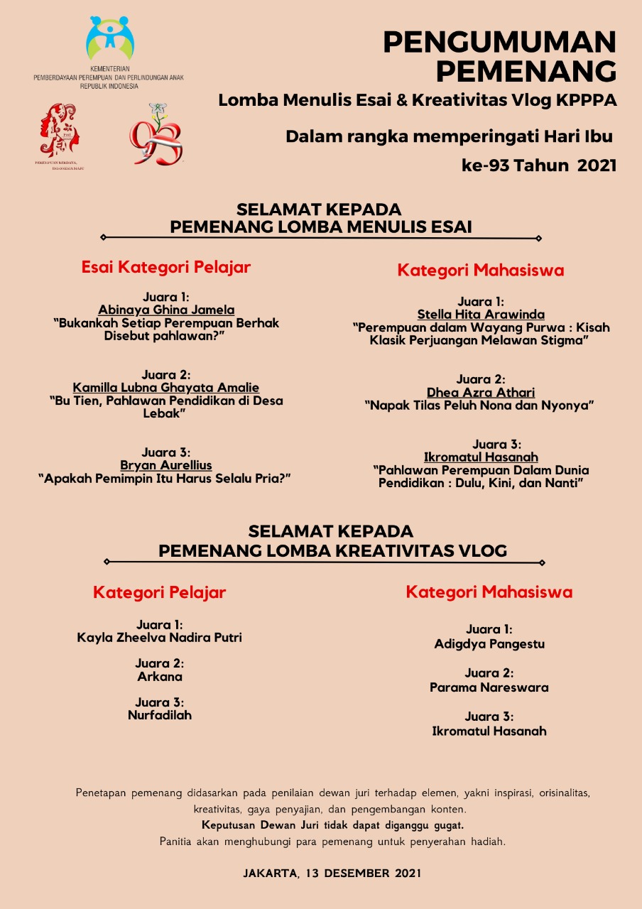 pengumuman Pemenang Lomba Menulias Esai dan Kreativitas Vlog KPPPA